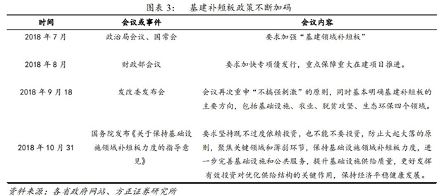 2018年年中以來(lái),基建補(bǔ)短板政策不斷加碼。2018年7月,政治局會(huì)議、國(guó)常會(huì)分別作出要求加強(qiáng)“基建領(lǐng)域補(bǔ)短板”,此后基建補(bǔ)短板政策不斷加碼,各省市重大項(xiàng)目加速落地。