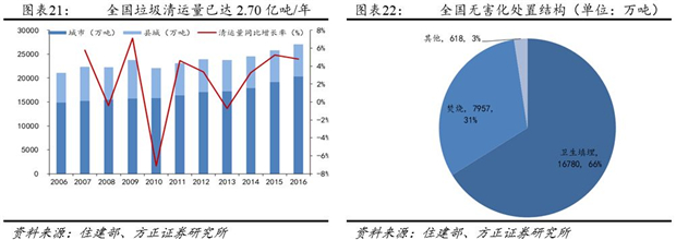 根據(jù)2016年住建部統(tǒng)計(jì)年鑒,目前我國(guó)生活垃圾年清運(yùn)量2.70億噸,無(wú)害化處置率約94%。無(wú)害化處置中,填埋、焚燒、其他的比例分別為66%、31%和3%,填埋仍是無(wú)害化處置的主流方式。