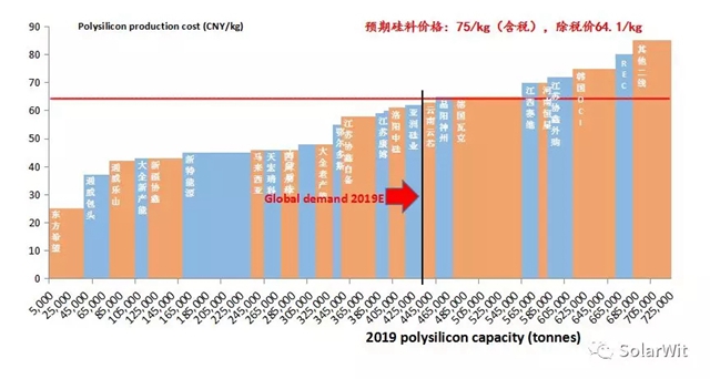可以看到,要想滿足2019年全行業(yè)的硅料需求,還需要亞洲硅業(yè)、洛陽中硅等產(chǎn)能維持運轉(zhuǎn)。但是韓國OCI已經(jīng)在平衡曲線之外,再好的需求都不能挽救韓國OCI的命運,命運同樣難以逆轉(zhuǎn)的企業(yè)還有賽維LDK、國電晶陽、江蘇協(xié)新外購電力部分產(chǎn)能。德國瓦克雖然也在供求平衡曲線之外,但是由于瓦克相當(dāng)大部分的產(chǎn)能是用于生產(chǎn)半導(dǎo)體級別的硅料,瓦克的產(chǎn)能不會輕易退出。