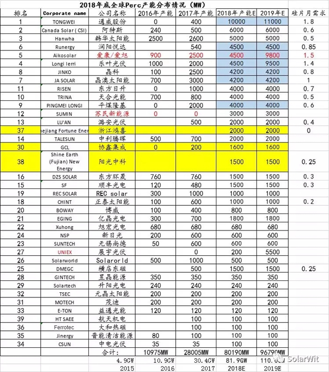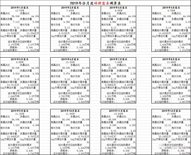 這個表格中的數(shù)據(jù)需要做一個說明,根據(jù)對供應(yīng)鏈的追蹤:12月當(dāng)月Perc的有效電池產(chǎn)能為60GW,并沒有達到圖中所說的81.9GW,這是因為從銘牌產(chǎn)能到有效產(chǎn)出還需要一個調(diào)試的過程。當(dāng)前有很多新建和技改的電池產(chǎn)能正在調(diào)試的路上,預(yù)期2019年3月份末會達產(chǎn),屆時每月對單晶硅片的需求量會達到12.1億片。