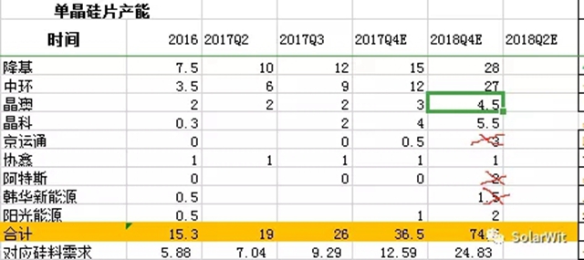 上面這張截圖是2017年年底總結(jié)的,現(xiàn)在回顧他發(fā)現(xiàn)基本不用修改,因為沒有新增的進入者,反倒是有幾家公司并沒有如期達產(chǎn);京運通原本計劃中的3GW產(chǎn)能現(xiàn)在也沒有蹤影;阿特斯之前拋出了雄心勃勃的計劃,但實際上目前只有24臺單晶爐做中試線;韓華新能源也同樣,并沒有有效產(chǎn)能出來,依然需要通過外部采購。當(dāng)前市場中有效的單晶硅片產(chǎn)能實際上只有四家但是由于晶科、晶澳只自用不外供,所以對于市場上第三方公開對外銷售的產(chǎn)能,有效供給只有兩家:隆基和中環(huán),在硅片環(huán)節(jié),迅速地形成了雙寡頭壟斷的產(chǎn)業(yè)格局。這是供給端,我們再看看單晶硅片的需求端:
