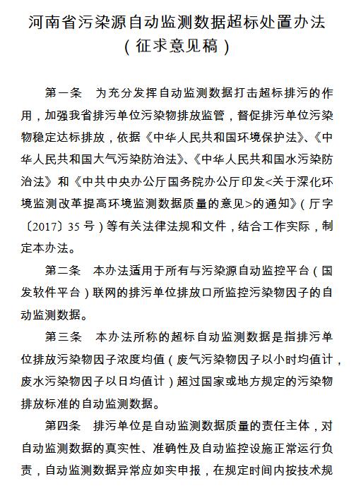 日前,河南印發(fā)《河南省污染源自動(dòng)監(jiān)測(cè)數(shù)據(jù)超標(biāo)處置辦法(征求意見稿)》。全文如下: