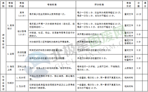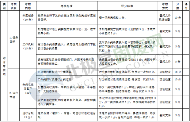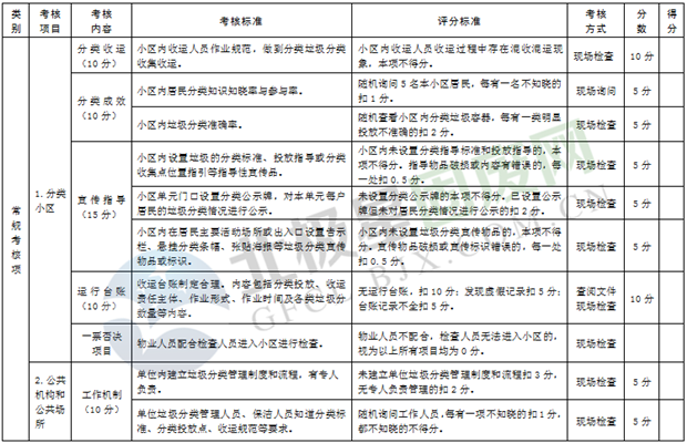 綜合考核:主要是考核各區(qū)市縣制度建設、運行管理、宣傳培訓、信息報送和日常檢查執(zhí)法等情況,由市垃圾分類工作領導小組人員采取現(xiàn)場檢查和資料查閱等方式進行。