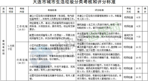 (二)考核內(nèi)容。對各區(qū)市縣和各街道的垃圾分類工作實行量化考核,考核項分為常規(guī)考核項、綜合考核項和社會監(jiān)督考核項,主要內(nèi)容包括:所轄居民分類小區(qū)、強制分類的公共機構(gòu)和公共場所的分類設施配置、分類收運管理及分類效果等方面,以及各區(qū)市縣和各街道開展垃圾分類管理組織保障、宣傳培訓和監(jiān)督檢查等情況。詳見附件《大連市城市生活垃圾分類考核和評分標準》。