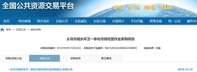 2018年12月19日,河南省義馬市城鄉(xiāng)環(huán)衛(wèi)一體化市場經(jīng)營作業(yè)采購項目發(fā)布中標公告,福建龍馬環(huán)衛(wèi)裝備股份有限公司成為中標供應商,中標金額為1535.76萬/年。