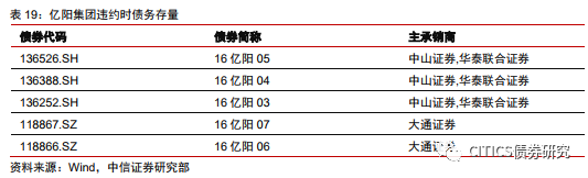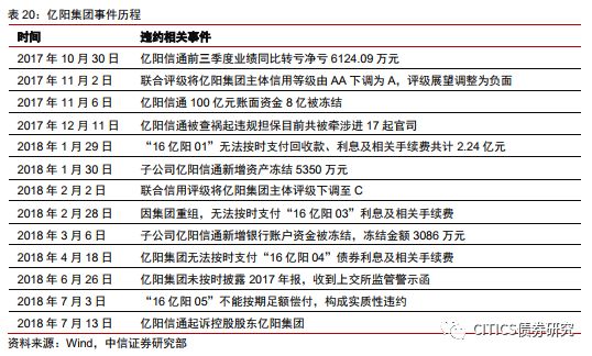 (3)母弱子強(qiáng),子公司盈利下滑觸發(fā)多只債券相繼違約。2017年中報中貨幣資金總額為48.6億元,其中17.4億元歸屬于上市子公司億陽信通,而負(fù)債主要集中在母公司。億陽信通前三季度業(yè)績同比虧損6124.09萬元,聯(lián)合評級下調(diào)其信用評級,外部融資進(jìn)一步惡化。2018年年初“16億陽01”的實質(zhì)性違約,進(jìn)一步暴露集團(tuán)內(nèi)部流動性收縮以及外部融資渠道不暢等風(fēng)險,此后三個季度內(nèi)相繼有4只債券違約。