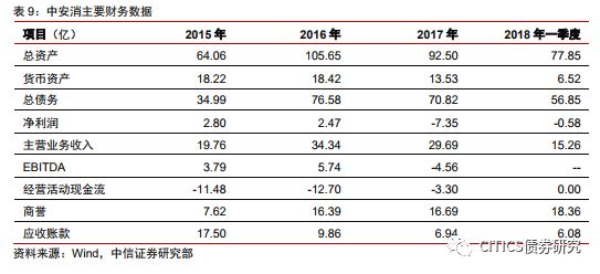 (2)負(fù)債驅(qū)動并購。中安消2015-2017年凈利潤為2.8億、2.5億、-7.4億,扣除非經(jīng)常損益后歸屬于母公司利潤同比增長27%、-82%、-2017%,中安消借殼上市置入資產(chǎn)經(jīng)營業(yè)績,在2015、2016年度均未達(dá)業(yè)績承諾,經(jīng)營質(zhì)量并沒有改善,公司自身運營并沒有明顯改善,靠發(fā)債補充公司流動資金。2015年12月,發(fā)行信用債“15中安消”,募集資金5億元,主要用于補充流動資金,截至2016年底,已使用49,600.00萬元用于補充公司流動資金。2016年11月份,發(fā)行“16中安消”募集資金11億元,截至2017年12月31日,已使用近4億元用于償還銀行借款及利息,近7億元用于補充公司流動資金。