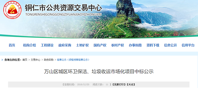 貴州省銅仁市萬山區(qū)城區(qū)環(huán)衛(wèi)保潔、垃圾收運市場化項目發(fā)布中標公示,東莞市家寶園林綠化有限公司成為中標的社會資本方,中標金額為3105萬/年,服務(wù)期限為10年。