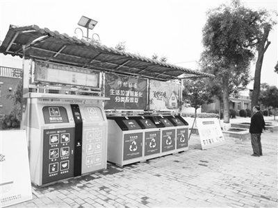 在何村社區(qū)廣場(chǎng)旁邊,有一個(gè)智能垃圾分類投放站。村民可將紙張、塑料、金屬、玻璃等可回收垃圾,分類裝進(jìn)橘黃色二維碼垃圾袋,或打包貼上二維碼,掃描后投放至由智能垃圾分類和可回收兩組箱組成的專用垃圾箱,機(jī)器自動(dòng)稱重,核算出價(jià)格,等垃圾回收工作人員分揀確認(rèn)之后,按不同類別向村民返還積分。積分可到指定地點(diǎn)兌換相應(yīng)的生活用品。