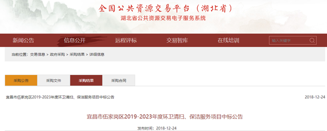 2018年12月24日,湖北省宜昌市伍家崗區(qū)2019-2023年度環(huán)衛(wèi)清掃、保潔服務項目中標公告出爐,北控水務(中國)投資有限公司成為中標的社會資本方,中標金額為2.24億。
