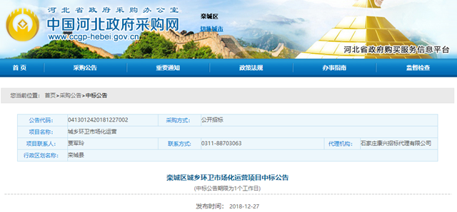 2018年12月27日,河北省欒城區(qū)城鄉(xiāng)環(huán)衛(wèi)市場化運營項目發(fā)布中標(biāo)公示。