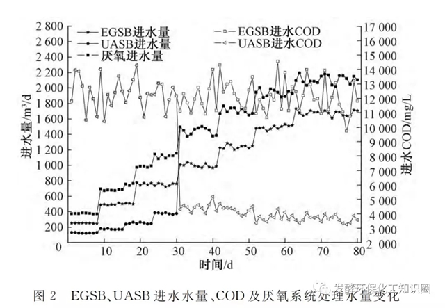 EGSB及UASB采用同類(lèi)檸檬酸生產(chǎn)廠家厭氧顆粒污泥啟動(dòng),EGSB和UASB投加的含水率94%的顆粒污泥量分別是600m3和300m3,占各自反應(yīng)器容積的45%和30%。EGSB、UASB進(jìn)水水量、COD及厭氧系統(tǒng)處理水量變化見(jiàn)圖2。
