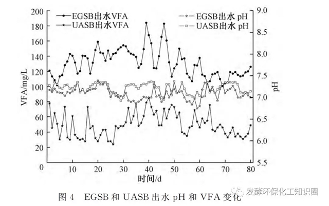 EGSB出水的VFA濃度在130±60mg/L;而UASB出水的VFA在50±25mg/L,UASB出水VFA低于EGSB出水VFA50%。上述EGSB和UASB的PH是適合甲烷菌生長(zhǎng)的,反應(yīng)器也沒(méi)有VFA的積累。同時(shí)UASB出水的VFA比EGSB出水的VFA低,也說(shuō)明UASB中有機(jī)物降解的更加徹底。