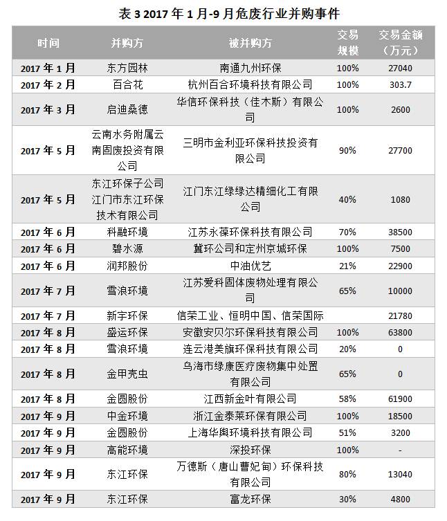 根據已有公開數據的不完全統(tǒng)計,截至2017年9月,2017年危廢行業(yè)發(fā)起并購行為19起起,累積交易金額32.46億元,并購方既包括像東江環(huán)保、啟迪桑德、新宇環(huán)保這樣的“行業(yè)老兵”,也不乏碧水源、盛運環(huán)保、中金環(huán)境等“后起之秀”,更有金圓股份等“跨界來者”。