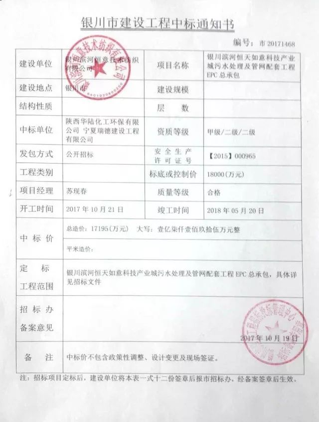 2017年10月19月,華陸環(huán)保憑借著豐富的行業(yè)經(jīng)驗(yàn)、良好的市場信譽(yù)、優(yōu)秀的設(shè)計(jì)團(tuán)隊(duì)、完善的服務(wù)體系以及專業(yè)的投標(biāo)方案,成功中標(biāo)銀川濱河恒天如意科技產(chǎn)業(yè)城污水處理及管網(wǎng)配套工程EPC總承包項(xiàng)目(以下簡稱:中標(biāo)項(xiàng)目),中標(biāo)金額為1.7195億元。