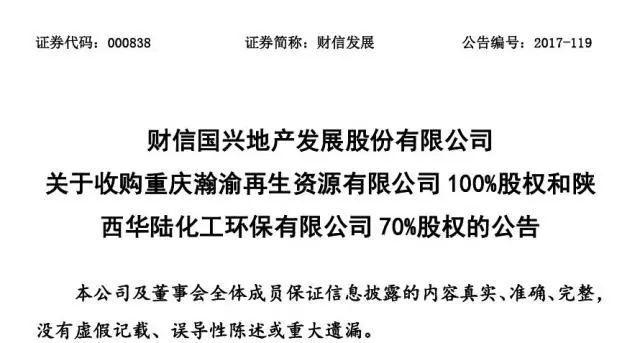 2017年9月29日,財(cái)信國興地產(chǎn)發(fā)展股份有限公司(以下簡稱“財(cái)信發(fā)展”,股票代碼:000838)收購陜西華陸化工環(huán)保有限公司70%股權(quán)(詳見《財(cái)信國興地產(chǎn)發(fā)展股份有限公司關(guān)于收購重慶瀚渝再生資源有限公司100%股權(quán)和陜西華陸化工環(huán)保有限公司70%股權(quán)的公告》),華陸環(huán)保成為財(cái)信發(fā)展的控股子公司。