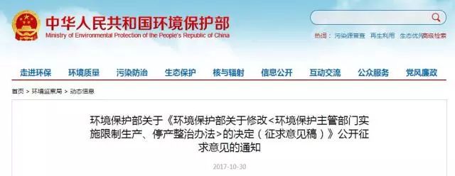 2017年10月30日,環(huán)境保護部網(wǎng)站公布修改《環(huán)境保護主管部門實施限制生產(chǎn)、停產(chǎn)整治辦法》的決定(征求意見稿)(以下簡稱“征求意見稿”),并向社會公開征求意見。