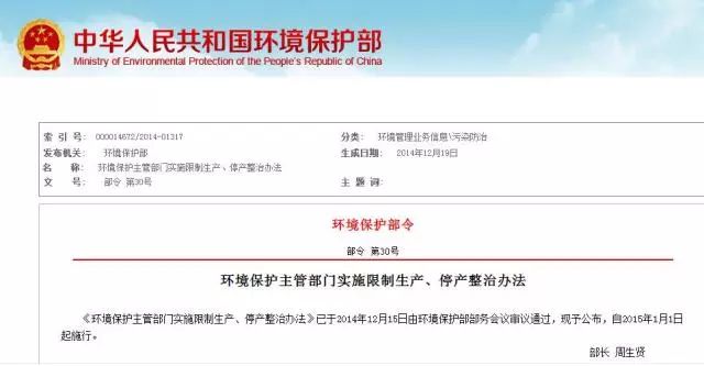《環(huán)境保護主管部門實施限制生產(chǎn)、停產(chǎn)整治辦法》已于2014年12月15日由環(huán)境保護部部務會議審議通過,現(xiàn)予公布,自2015年1月1日起施行。