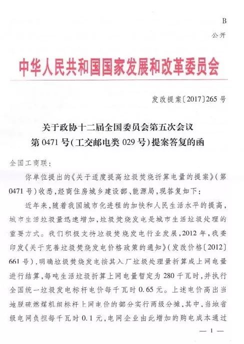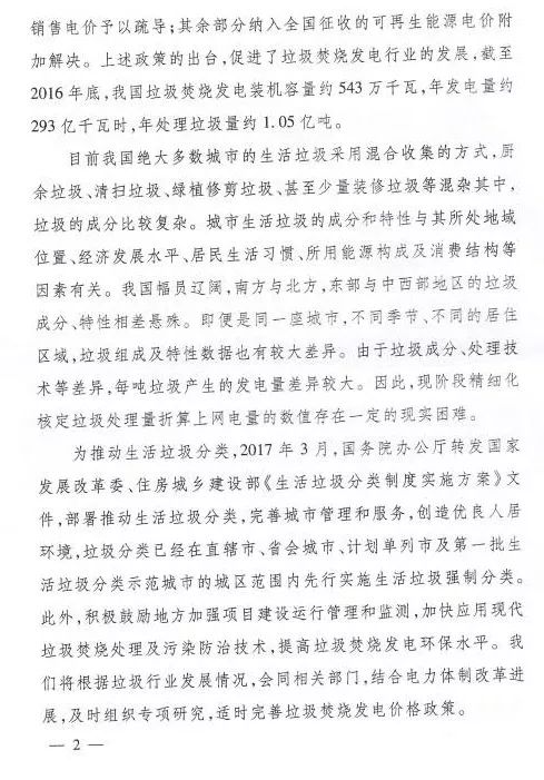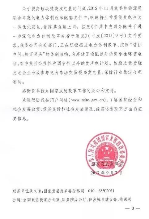 今年年初,環(huán)境商會以全國工商聯(lián)團體提案的形式向兩會遞交《關(guān)于適度提高垃圾焚燒折算電量的提案》,國家發(fā)改委于9月正式答復。