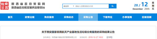 2018年12月27日,西安國(guó)家民用航天產(chǎn)業(yè)基地生活垃圾分類(lèi)服務(wù)發(fā)布采購(gòu)結(jié)果公告,中國(guó)天楹股份有限公司成為中標(biāo)的社會(huì)資本方,中標(biāo)金額為591萬(wàn)。