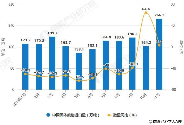 據(jù)前瞻產(chǎn)業(yè)研究院發(fā)布的《中國固廢處理行業(yè)市場前瞻與投資戰(zhàn)略規(guī)劃分析報告》統(tǒng)計數(shù)據(jù)顯示,2018年11月中國固體廢物進口量大幅度增長,2018年11月中國固體廢物進口量為226.3萬噸,同比增長3.3%。