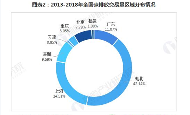 經(jīng)過5年試點(diǎn)以及1年全國性交易,根據(jù)前瞻產(chǎn)業(yè)研究院的統(tǒng)計(jì),截止2018年底,我國碳排放交易量累計(jì)接近8億噸,其中交易量最多的是湖北碳排放交易所,達(dá)到3.3億噸,占比42.14%;其次是上海碳排放交易所,交易量為1.9億噸,占比24.51%;福建碳排放交易所、天津碳排放交易所以及重慶碳排放交易所截至目前的交易量還相對較小,合計(jì)占比補(bǔ)足5%。