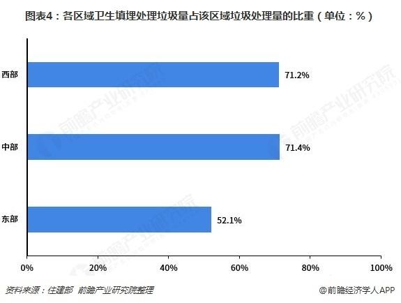 我國各地區(qū)填埋處理占生活垃圾無害化比例保持著東低中西高的趨勢,我國東部、中部和西部地區(qū)的生活垃圾填埋處理占無害化比例分別為52.1%、71.4%和71.2%。其中西部地區(qū)的填埋處理量占無害化比例相對(duì)東中部地區(qū)較為明顯,主要來自于焚燒處理占比的大幅增長。