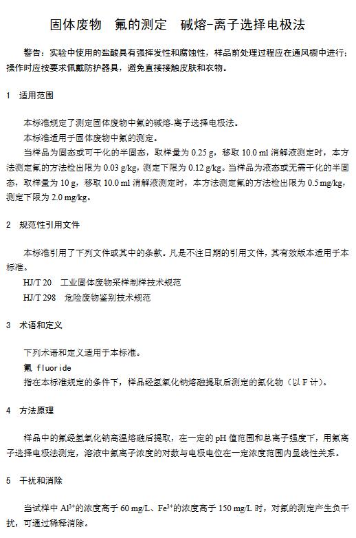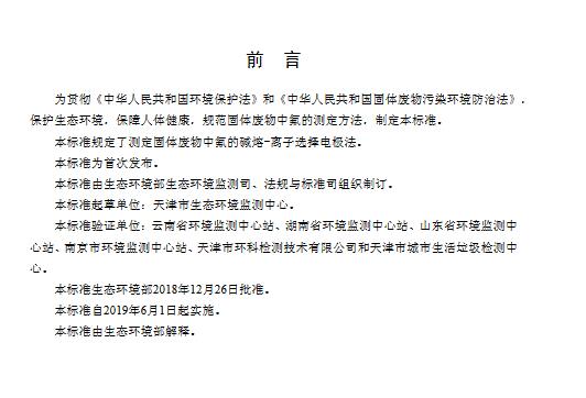 日前生態(tài)環(huán)境部發(fā)布了國家環(huán)境保護(hù)標(biāo)準(zhǔn):《固體廢物氟的測定 堿熔-離子選擇電極法》(HJ 999-2018),具體內(nèi)容如下:
