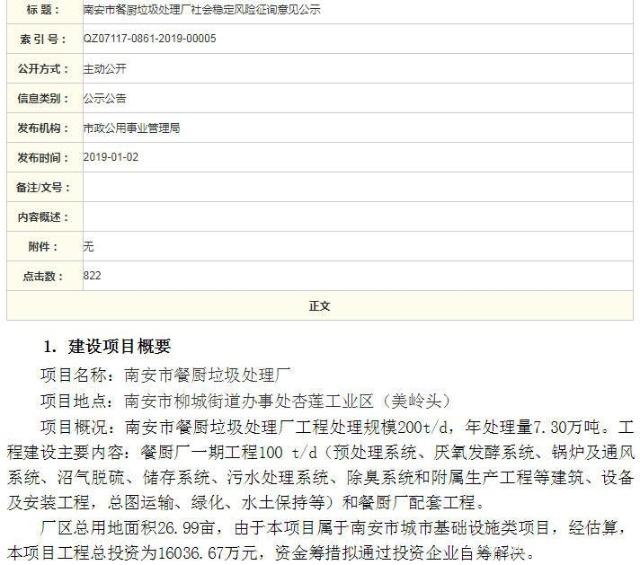 2019年1月2日,南安市政公用事業(yè)管理局發(fā)布兩份《社會穩(wěn)定風險征詢意見公示》,主要內(nèi)容關于南安市生活垃圾焚燒發(fā)電廠提級改造,以及南安市餐廚垃圾處理廠建設兩項工程。具體如下: