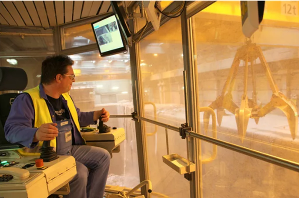 工人在玻璃封閉操作室操縱大吊抓鉤將垃圾抓送入焚燒爐填料口。