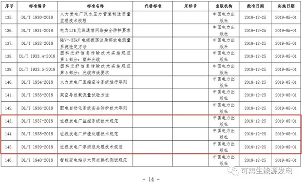 2018年12月25日,國家能源局發(fā)布2018年第16號公告,批準(zhǔn)了204項(xiàng)行業(yè)標(biāo)準(zhǔn),并予以發(fā)布。其中由中國電力企業(yè)聯(lián)合會垃圾發(fā)電標(biāo)準(zhǔn)化技術(shù)委員會提出并組織編制的第二批三項(xiàng)電力行業(yè)標(biāo)準(zhǔn)《垃圾發(fā)電廠監(jiān)控系統(tǒng)技術(shù)規(guī)范》(DL/T 1937-2018)、《垃圾發(fā)電廠爐渣處理技術(shù)規(guī)范》(DL/T1938-2018)、《垃圾發(fā)電廠滲瀝液處理技術(shù)規(guī)范》(DL/T 1939-2018),將于2019年5月1日起正式實(shí)施。
