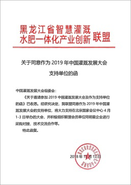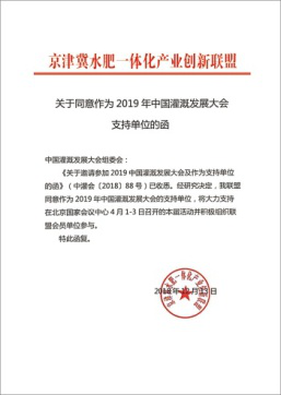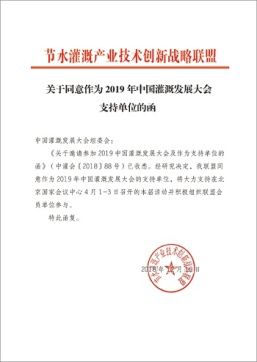 在2019年新年開篇之時,來自全國各節(jié)水灌溉聯盟及協會對中國灌溉發(fā)展大會的支持回函如雨后春筍般紛紛到達,本周之內,中國塑料加工工業(yè)協會塑料節(jié)水器材專業(yè)委員會、中國生態(tài)農業(yè)產業(yè)技術創(chuàng)新戰(zhàn)略聯盟、節(jié)水灌溉產業(yè)技術創(chuàng)新戰(zhàn)略聯盟、新疆兵團節(jié)水灌溉產業(yè)技術創(chuàng)新戰(zhàn)略聯盟、京津冀水肥一體化產業(yè)創(chuàng)新聯盟、黑龍江省智慧灌溉水肥一體化產業(yè)創(chuàng)新聯盟紛紛致函組委會,表示將大力支持在北京國家會議中心4月1-3日召開的大會并積極組織相關會員單位參與同期活動。