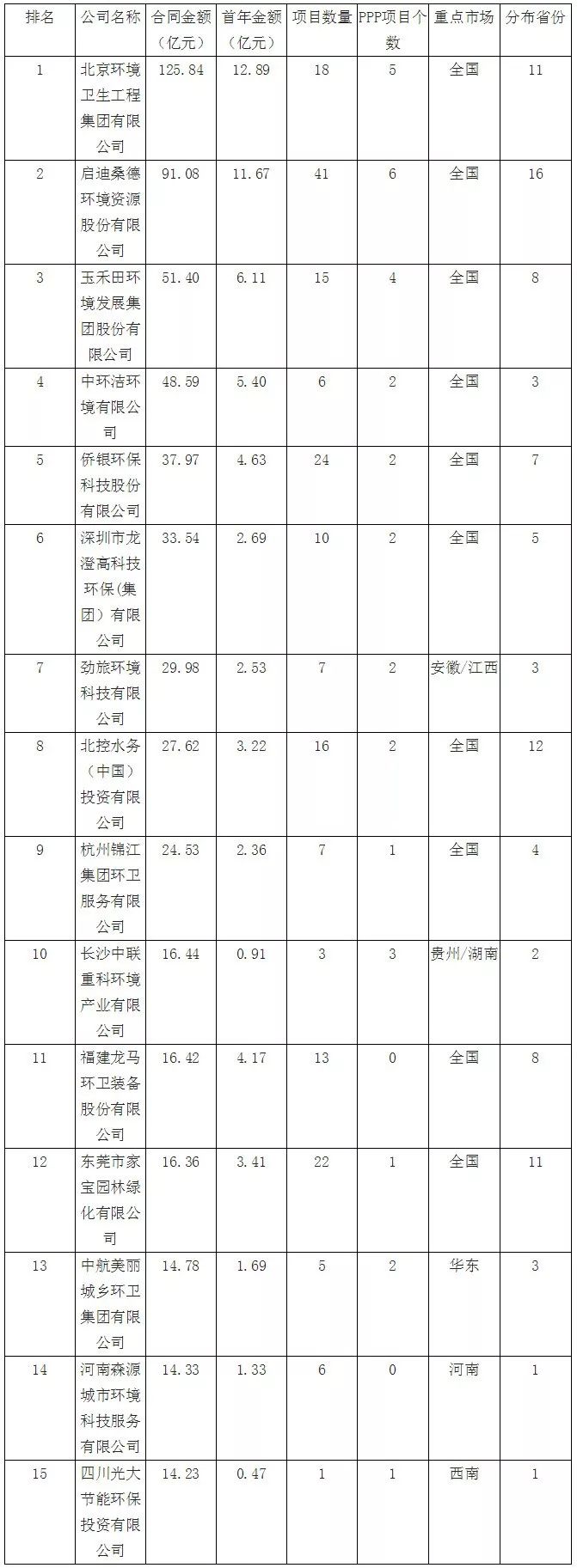 2018年上半年環(huán)衛(wèi)市場化中標合同金額TOP15