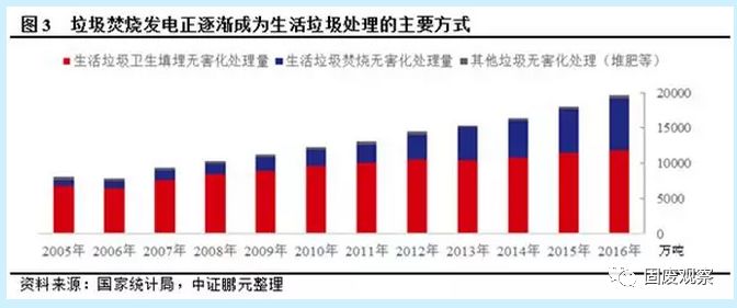 垃圾焚燒發(fā)電具有其他垃圾處理方式無法比擬的優(yōu)勢,其處理規(guī)模上升較快。生活垃圾處理大致分為衛(wèi)生填埋、焚燒和堆肥等方式,前兩種方式為主。從全國來看,衛(wèi)生填埋目前是生活垃圾無害化處理的主流方式,2016年占比60.32%,但垃圾焚燒符合“垃圾處理十三五規(guī)劃”中的“減量化、無害化、資源化”三原則,垃圾焚燒后,一般體積可減少90%以上,重量減輕80%以上。垃圾焚燒后再填埋,可以有效地減少對土地資源的占用。高溫焚燒后可消除垃圾中大量有害病菌、有毒物質和惡臭氣體,同時垃圾滲濾液可以高溫分解,避免污染地下水。垃圾焚燒后產生的熱能可用于發(fā)電供熱,燃燒后的廢渣可以用于建筑材料生產,實現資源的綜合利用。