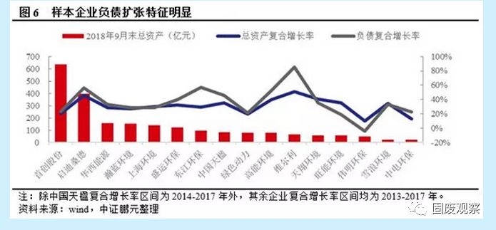樣本企業(yè)總資產規(guī)模差異較大,負債帶動資產擴張?zhí)卣髅黠@。從2018年9月末資產規(guī)模來看,首創(chuàng)股份居首,啟迪桑德位于第二,均超過350億元,100-200億元的企業(yè)有4家,100億元以下企業(yè)10家。生活垃圾焚燒發(fā)電領域市場空間大,國家支持力度強,項目運營期經濟效益穩(wěn)定,在PPP政策的推動下,業(yè)內企業(yè)積極通過投資、并購占領市場,2013-2017年樣本企業(yè)總資產復合增速29.83%,16家樣本企業(yè)中有11家負債年復合增速超過總資產復合增速。