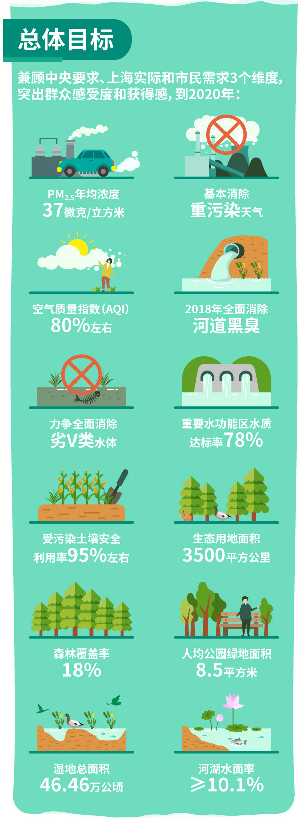 具體指標上,到2020年,大氣方面,PM2.5年均濃度降到37微克/立方米,基本消除重污染天氣,環(huán)境空氣質(zhì)量優(yōu)良率(AQI)達到80%左右;水方面,全面穩(wěn)定消除河道黑臭,力爭全面消除劣Ⅴ類水體;土壤方面,土壤環(huán)境質(zhì)量總體保持穩(wěn)定,受污染耕地及污染地塊安全利用率達到95%左右;生態(tài)方面,森林覆蓋率達到18%,人均公園綠地面積達到8.5平方米,濕地總面積維持在46.46萬公頃,河湖水面率不低于10.1%。