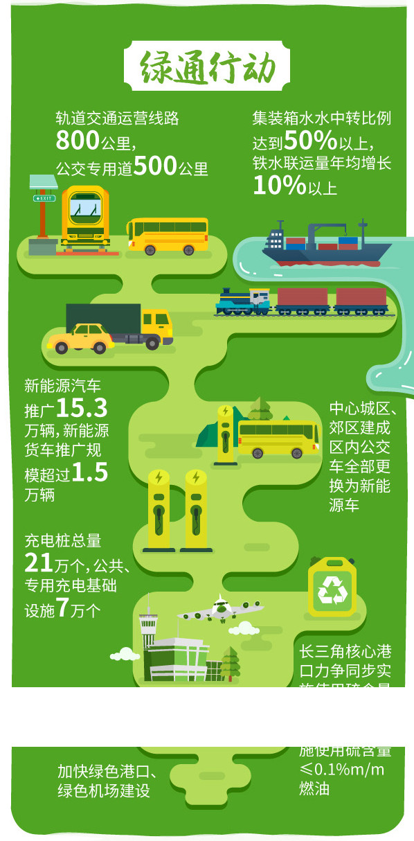 “綠通行動”聚焦交通運輸結(jié)構(gòu)調(diào)整,大力發(fā)展水中轉(zhuǎn)、水鐵聯(lián)運等多式聯(lián)運,加大新能源汽車推廣,實施更嚴格船舶排放區(qū)控制,推進綠色港口、機場建設(shè)等。到2020年,基本建成綠色高效交通運輸體系。