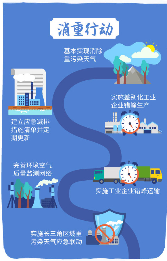 “消重行動”聚焦重點時段(秋冬季)和重點領(lǐng)域(高污染重點行業(yè)),以減少重污染天氣為著力點,科學(xué)預(yù)警、分級管控,合理實施差別化錯峰生產(chǎn)和錯峰運輸,確保到2020年基本消除重污染天氣。