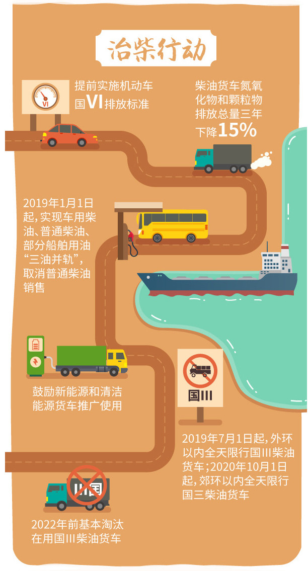 “治柴行動”聚焦柴油貨車污染治理,堅持源頭控制與末端治理相結(jié)合、鼓勵淘汰與強制限行相結(jié)合、本市治理與區(qū)域聯(lián)動相結(jié)合,建成柴油貨車遠程在線監(jiān)控系統(tǒng),進一步加強日常監(jiān)管和部門聯(lián)動。到2020年,柴油貨車氮氧化物和顆粒物排放總量比2017年下降15%。