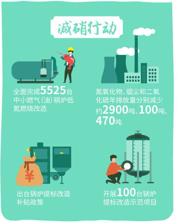 “減硝行動”聚焦中小燃氣(油)鍋爐提標改造,通過政策引導(dǎo)、標準引領(lǐng)、執(zhí)法推動、示范先行等措施,確保到2020年9月底完成5525臺中小燃氣(油)鍋爐低氮燃燒治理改造。