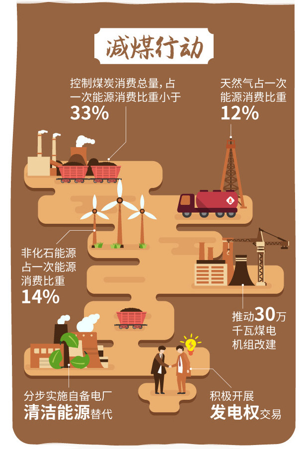 “減煤行動”聚焦煤炭消費總量控制,進一步削減鋼鐵、石化行業(yè)用煤總量,控制發(fā)電行業(yè)煤炭總量,穩(wěn)定增加外來電供應(yīng)比例和非化石能源消費比重。到2020年,煤炭消費總量比2015年下降5%以上,煤炭占一次能源消費比重下降到33%以下。