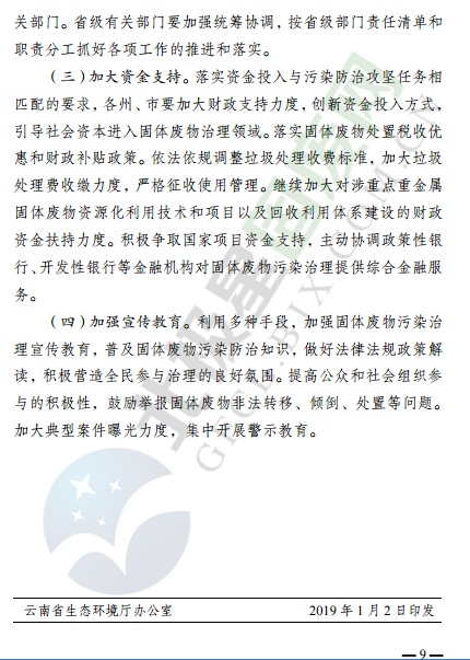 近日,云南省環(huán)境保護(hù)廳發(fā)布了云南省固體廢物污染治理攻堅(jiān)戰(zhàn)實(shí)施方案,針對(duì)固廢處理監(jiān)管、治理重點(diǎn)方向和行業(yè)等提出了明確要求,詳情如下: