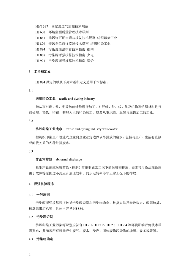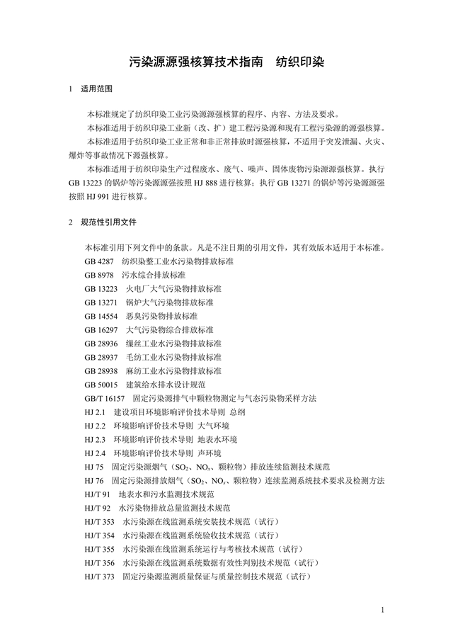 為貫徹《中華人民共和國(guó)環(huán)境保護(hù)法》《中華人民共和國(guó)環(huán)境影響評(píng)價(jià)法》《中華人民共和國(guó)大氣污染防治法》《中華人民共和國(guó)水污染防治法》《中華人民共和國(guó)環(huán)境噪聲污染防治法》《中華人民共和國(guó)固體廢物污染環(huán)境防治法》等法律法規(guī),完善固定污染源源強(qiáng)核算方法體系,指導(dǎo)和規(guī)范紡織印染工業(yè)污染源源強(qiáng)核算工作,制定本標(biāo)準(zhǔn)。本標(biāo)準(zhǔn)規(guī)定了紡織印染工業(yè)廢水、廢氣、噪聲、固體廢物污染源強(qiáng)核算的程序、內(nèi)容、方法及要求等。本標(biāo)準(zhǔn)附錄 A 為資料性附錄。本標(biāo)準(zhǔn)為首次發(fā)布。