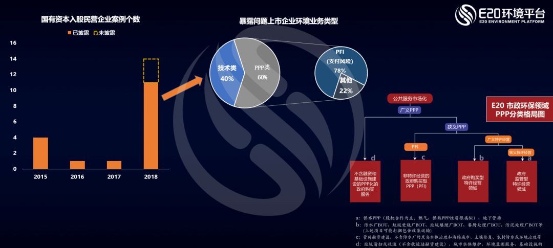 接著,薛濤對(duì)近年來發(fā)生的國有資本入資上市民企(參股及控股)情況進(jìn)行了簡要分析。首先從下圖所顯示的數(shù)量上來看,前幾年發(fā)生的頻率均較低,但進(jìn)入2018年以來已經(jīng)超過10起,這與今年的金融、政策等大環(huán)境的變化息息相關(guān)。但進(jìn)一步拆分來看,2018年發(fā)生的事件中有40%是技術(shù)類企業(yè),沒有做任何類型的PPP,與PPP無關(guān)。而在與PPP相關(guān)的剩余60%的企業(yè)中,PFI模式成為主因的比例又達(dá)到了78%的比例,這些企業(yè)在前些年P(guān)PP高速增長階段由于大量承接PFI項(xiàng)目帶來了大幅的業(yè)績增長。但近年來由于金融、政策等大環(huán)境的變化導(dǎo)致過多PFI項(xiàng)目在手的這類企業(yè)受到了較大的沖擊,其中民企由于融資短板而受到了更大的影響,也才帶來這些事件的發(fā)生。合計(jì)評(píng)估,本輪PPP中的新增類型--PFI模式,結(jié)合資本泡沫的大起大落,確實(shí)是構(gòu)成2017年以來環(huán)保領(lǐng)域本輪國進(jìn)民退的主因。