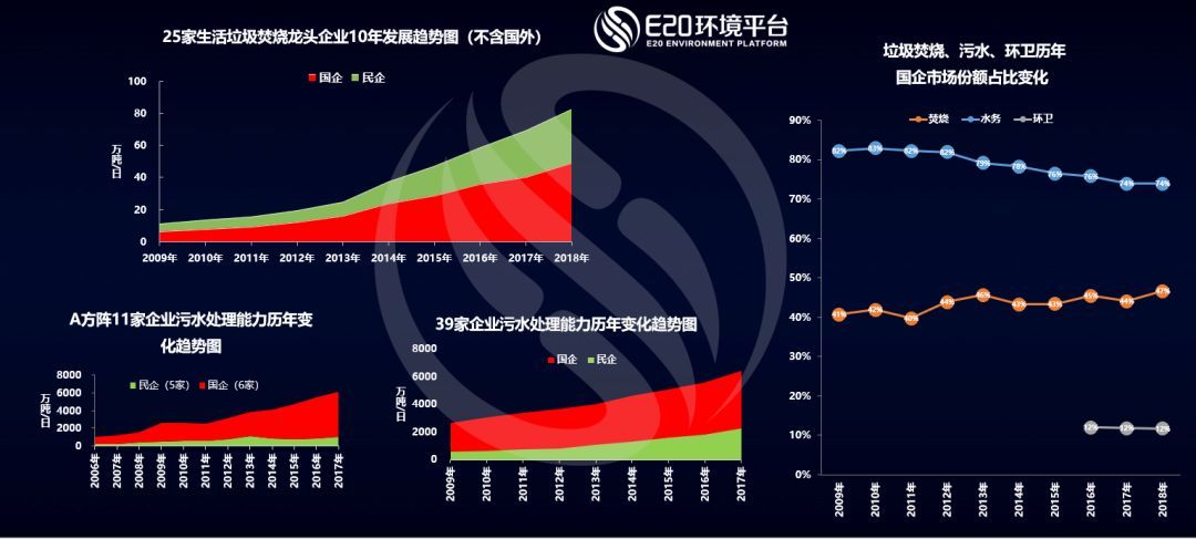 上圖所示為E20研究院數(shù)據(jù)中心統(tǒng)計(jì)近年來我國生活垃圾焚燒及污水處理行業(yè)國企及民企業(yè)績增長的變化。右圖中可以看到,國企市場占比基本穩(wěn)定,污水處理行業(yè)保持在75%左右(這次E20研究院數(shù)據(jù)中興加入了39家來分析十年的國進(jìn)民退走勢,與左側(cè)之前的11家的統(tǒng)計(jì)有很大的不同,值得關(guān)注),垃圾焚燒行業(yè)保持在45%左右,環(huán)衛(wèi)則穩(wěn)定在12%。