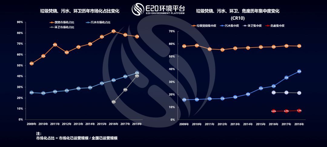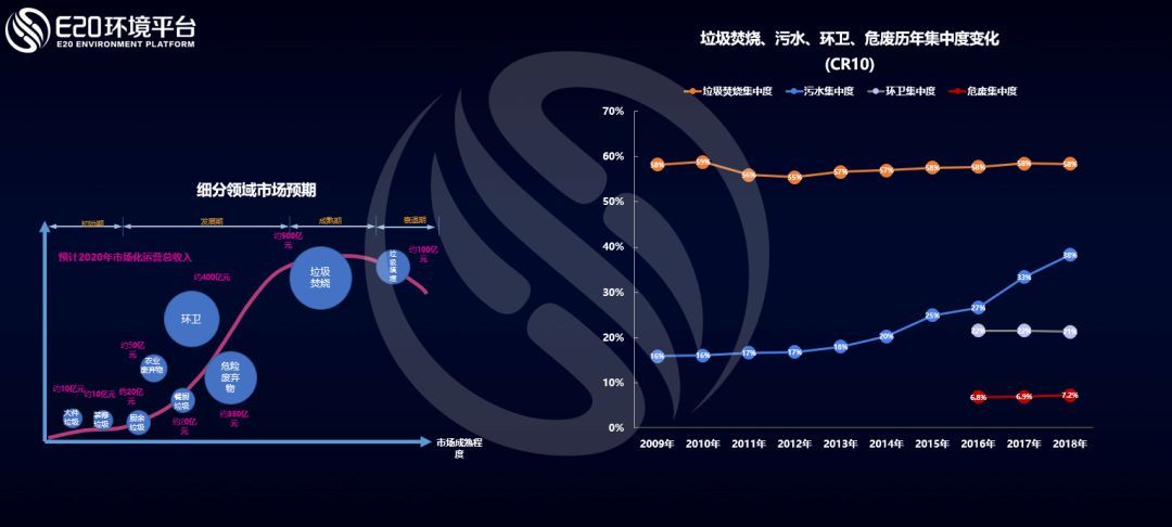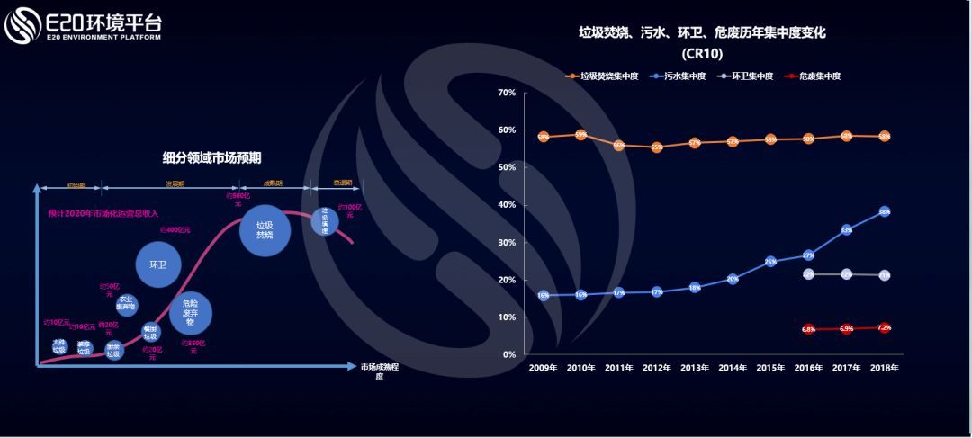 而通過E20研究院數(shù)據(jù)中心對(duì)各細(xì)分領(lǐng)域龍頭企業(yè)的跟蹤調(diào)研發(fā)現(xiàn),我國生活垃圾焚燒領(lǐng)域市場集中度CR10(前十家企業(yè)的市場占有率之和)近10年來穩(wěn)定在58%左右;污水處理行業(yè)集中度CR10持續(xù)增長,至2018年達(dá)到38%左右;環(huán)衛(wèi)行業(yè)和危廢行業(yè)的市場集中度CR10均基本穩(wěn)定,分別保持在20%和7%左右,市場仍較分散,這個(gè)原因是市場釋放非??欤逻M(jìn)入者眾多,仍處于行業(yè)的快速上升期。