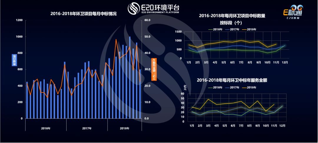 上圖可見,根據(jù)E20環(huán)境平臺(tái)E標(biāo)通對(duì)近三年的數(shù)據(jù)分析,可以看出,環(huán)衛(wèi)項(xiàng)目每個(gè)月的中標(biāo)數(shù)量呈現(xiàn)在波動(dòng)中上升趨勢,這與E20研究院對(duì)環(huán)衛(wèi)市場化發(fā)展的趨勢預(yù)判高度吻合。中標(biāo)金額也呈上揚(yáng)趨勢,環(huán)衛(wèi)市場火熱程度可見一斑。