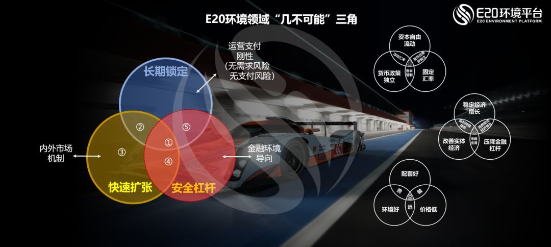 正如前面所講,為主導(dǎo)朋友圈自媒體往往充斥了各種恐慌,比如廣泛流傳的外匯不可能三角、金融市場不可能三角、以及房地產(chǎn)不可能三角理論體系。不過,這種三角模型很符合E20研究院所習(xí)慣的圖形邏輯組合的分析思路,所以我們回顧過去,也為環(huán)境企業(yè)家總結(jié)了 “E20環(huán)境領(lǐng)域‘幾不可能’三角“。結(jié)合前面提到的PPP方面的研究,E20研究院選取了長期鎖定、快速擴(kuò)張以及安全杠桿作為構(gòu)建“E20環(huán)境領(lǐng)域幾不可能三角”的三個(gè)要素。這三個(gè)要素的綜合內(nèi)外分析對(duì)于任何環(huán)保企業(yè),無論是技術(shù)型企業(yè)還是投資運(yùn)營型企業(yè),都可以作為戰(zhàn)略規(guī)劃的參考。(相關(guān)閱讀→ 讀薛濤解析環(huán)保PPP之“幾不可能三角”:思維碰撞殊途同歸)