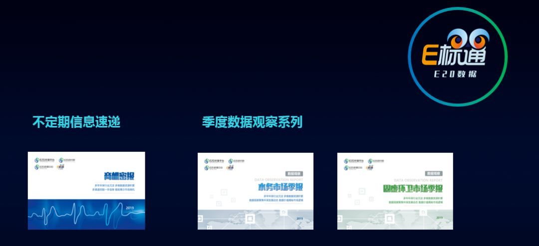 E20研究院數(shù)據(jù)中心將以E標(biāo)通為基礎(chǔ),從環(huán)衛(wèi)市場化機(jī)會(huì)出發(fā),兼顧污水、垃圾等投資運(yùn)營細(xì)分領(lǐng)域,并逐步擴(kuò)展到工程、設(shè)備等各細(xì)分領(lǐng)域,為圈層會(huì)員企業(yè)提供免費(fèi)“環(huán)衛(wèi)商機(jī)密報(bào)”、“水務(wù)市場季度觀察”、“固廢環(huán)衛(wèi)市場季度觀察”等數(shù)據(jù)產(chǎn)品,敬請(qǐng)期待。
