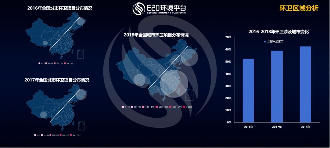 從區(qū)域分布角度看,E20研究院數(shù)據(jù)中心以胡煥庸線為界詳細(xì)分析了所有的城市(包括縣級(jí)市)的項(xiàng)目情況,根據(jù)區(qū)域抽樣可以看出,在2018年,環(huán)衛(wèi)項(xiàng)目分布密度最高的地區(qū)是經(jīng)濟(jì)發(fā)展程度較高的東南沿海,但值得注意的是,包括西南、東北等經(jīng)濟(jì)發(fā)展水平相對(duì)較差的地區(qū),環(huán)衛(wèi)項(xiàng)目均出現(xiàn)了大幅增加。上面圖片的右圖是當(dāng)前所有縣級(jí)市中出現(xiàn)環(huán)衛(wèi)市場化情況的占比變化。